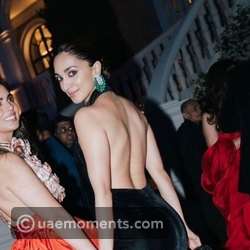 The picture shows Advani wearing a backless, black velvet dress while Ambani wore a burnt sienna-colored gown.